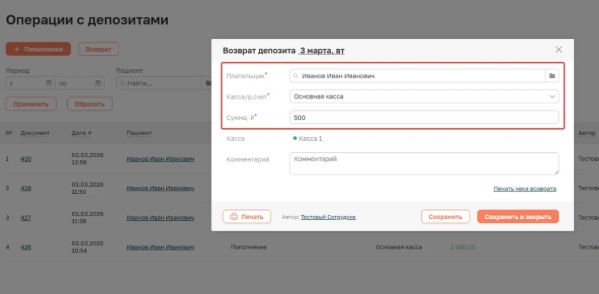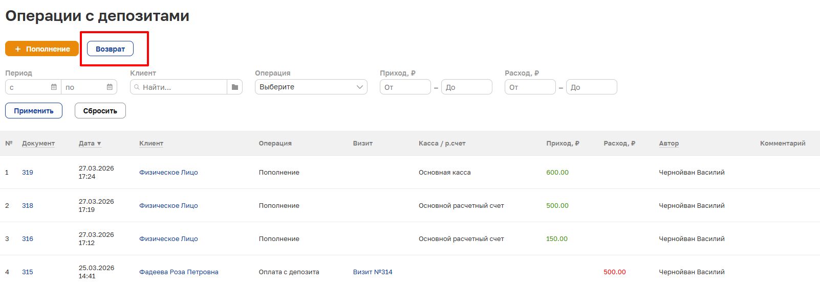 Важно: Оформление возвратов и просмотр отчетов по депозитам доступны только при наличии соответствующих прав доступа.