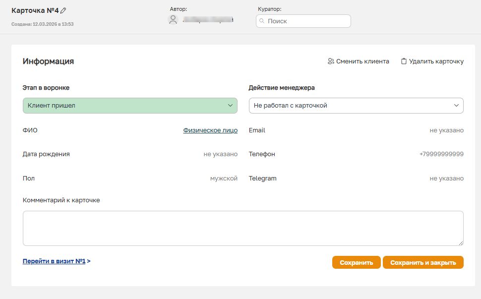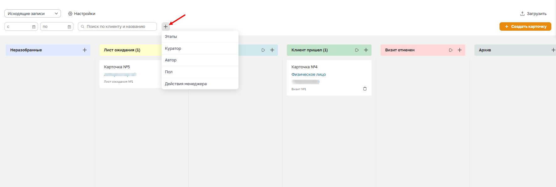 Фильтр помогает быстро находить карточки, по которым требуется дальнейшая работа или повторное взаимодействие с клиентом.