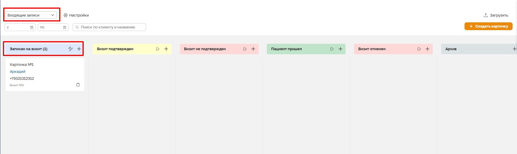 В системе для работы с онлайн-заявками автоматически создается воронка «Входящие заявки». Данная воронка предназначена для отображения и обработки обращений клиентов, которые были оформлены через онлайн-запись.