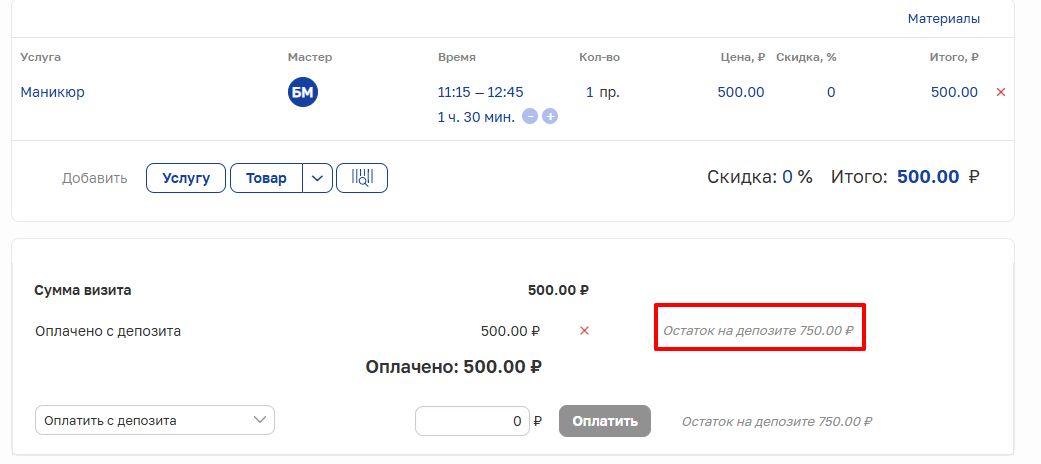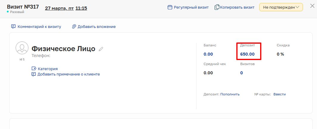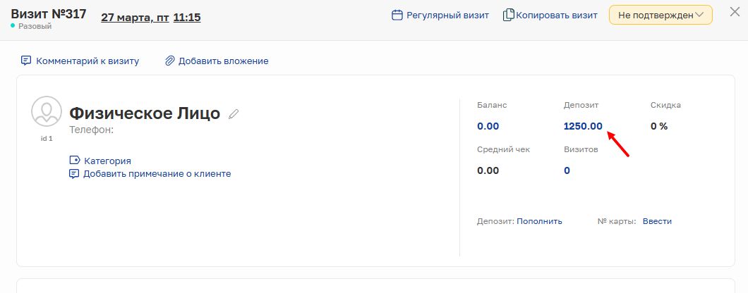 Шаг 4. Убедитесь, что баланс депозита увеличился в карточке визита.