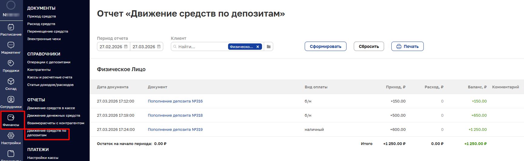 - Перейдите: Финансы - Отчеты - Движение средств по депозитам;